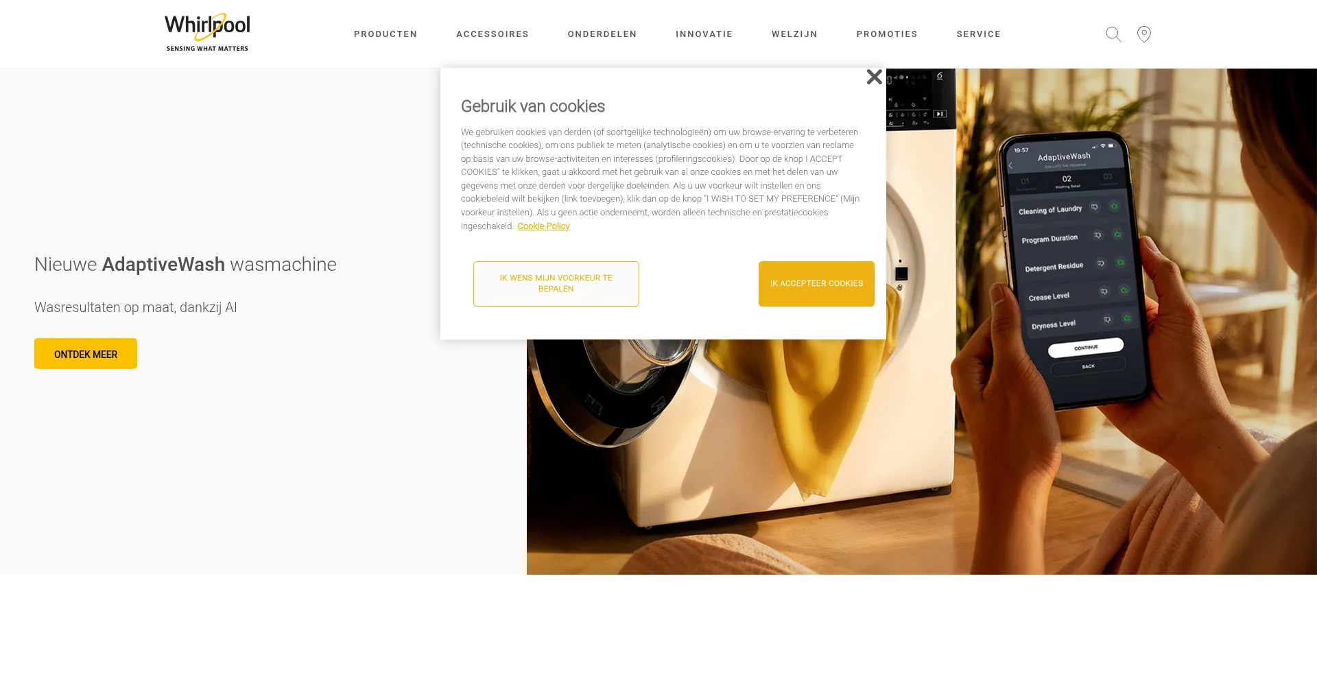 The website implements cookie consent mechanisms in compliance with privacy regulations such as GDPR or CCPA. This demonstrates that whirlpool.nl adheres to data protection standards and provides users with control over personal data collection practices.