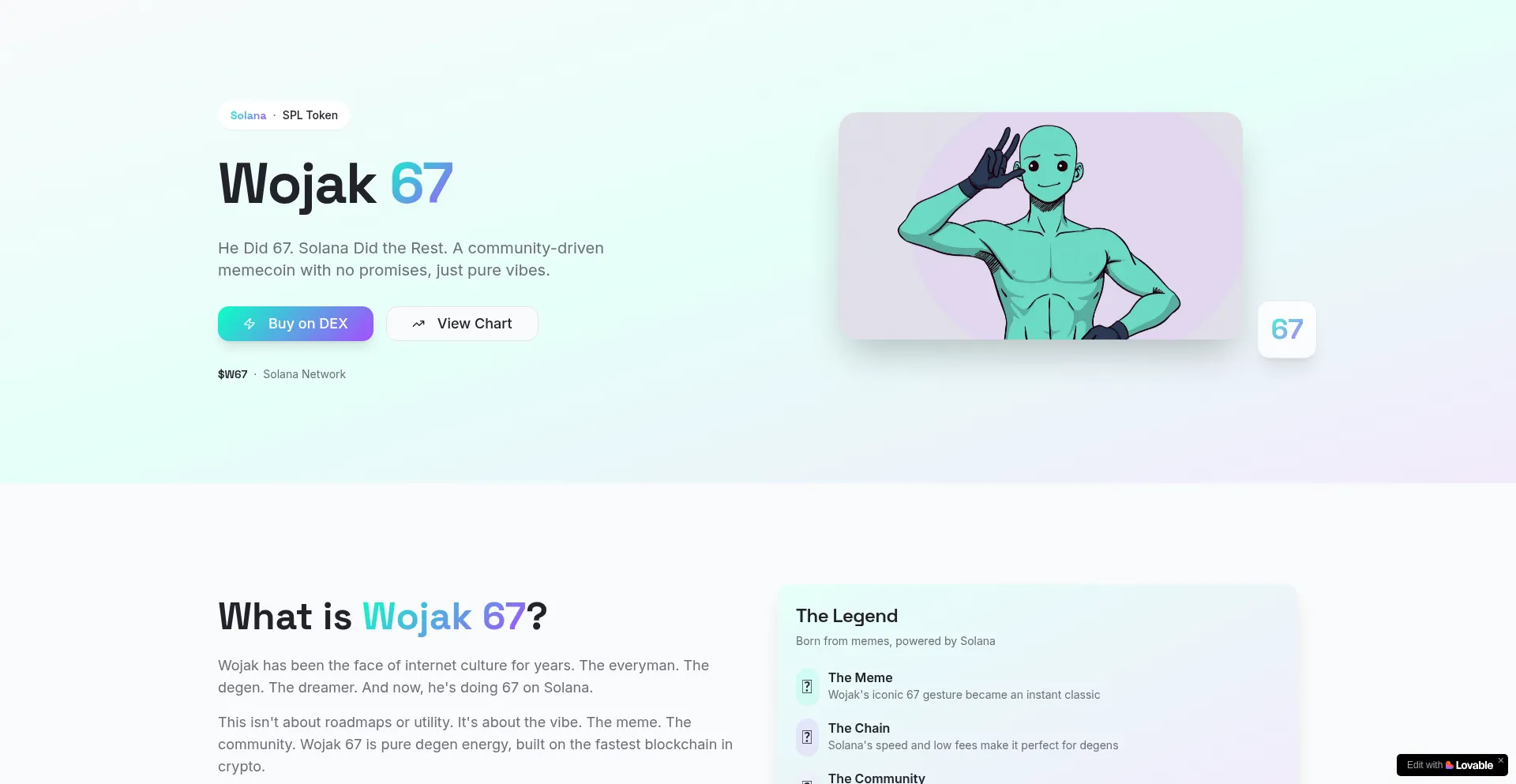 Wojak 67 on Solana - A community-driven memecoin inspired by the legendary 67 meme. Pure vibes, no promises.