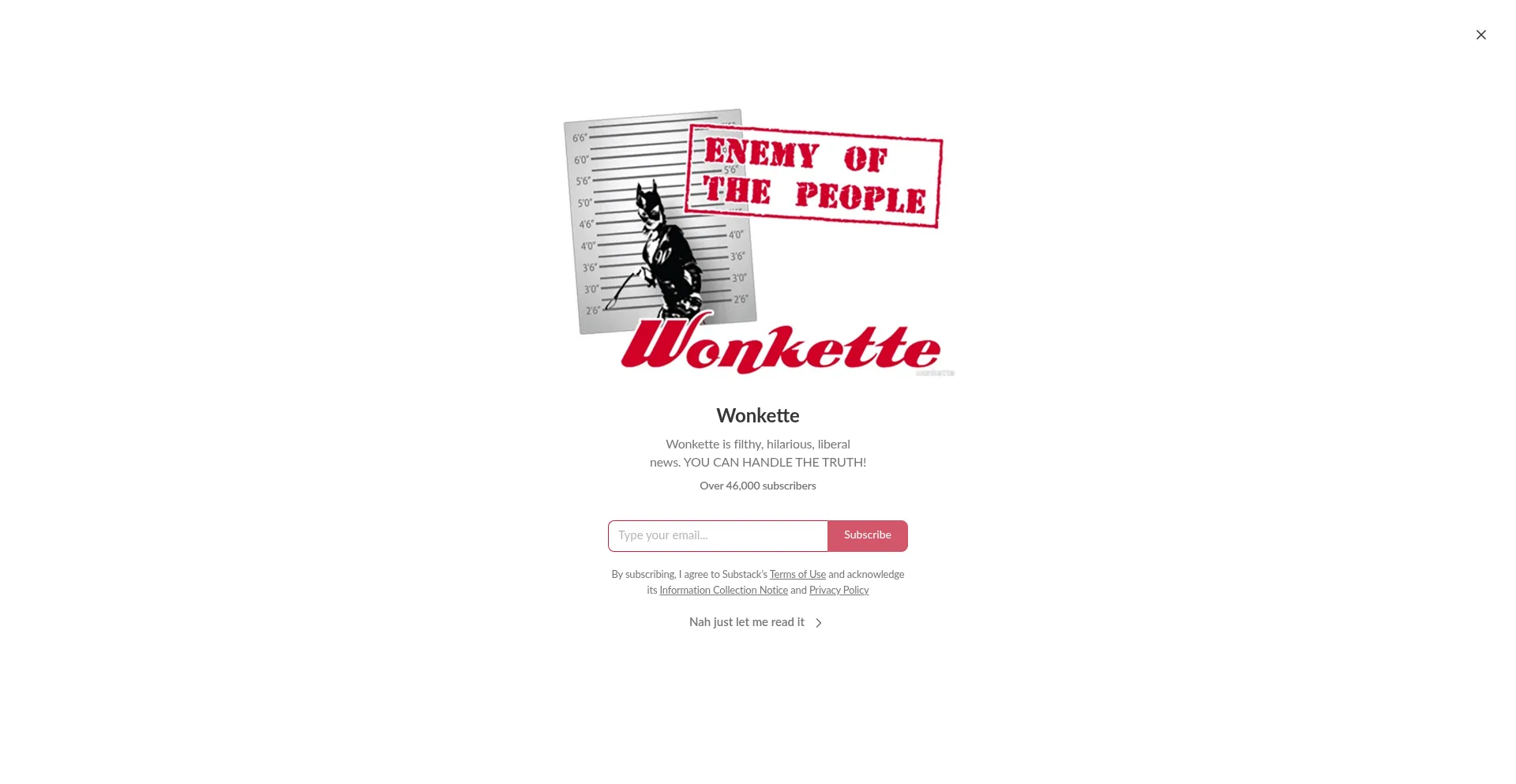 Wonkette is filthy, hilarious, liberal news. YOU CAN HANDLE THE TRUTH! Click to read Wonkette, by Rebecca Schoenkopf, a Substack publication with tens of thousands of subscribers.
