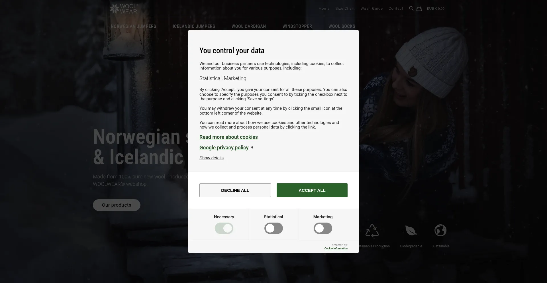 The website implements cookie consent mechanisms in compliance with privacy regulations such as GDPR or CCPA. This demonstrates that wool-wear.com adheres to data protection standards and provides users with control over personal data collection practices.