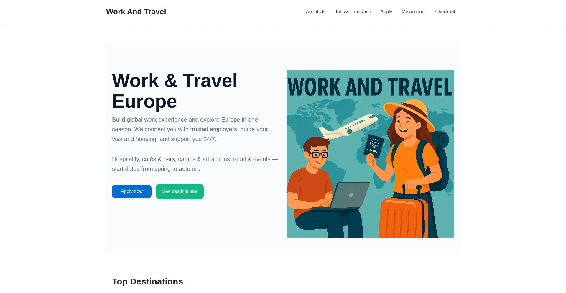 Analysis indicates that workandtravel.work operates as an e-commerce platform facilitating online transactions for goods or services. The website implements shopping cart functionality, payment processing systems, and product catalog features typical of commercial retail operations.