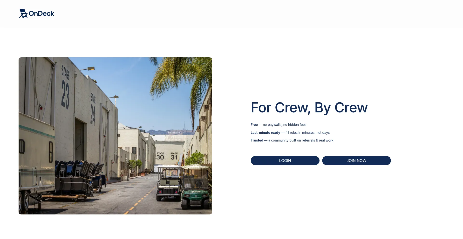 Find trusted film & TV crew fast. OnDeck is always free — no paywalls, no hidden fees. Last-minute ready to fill production roles in minutes.