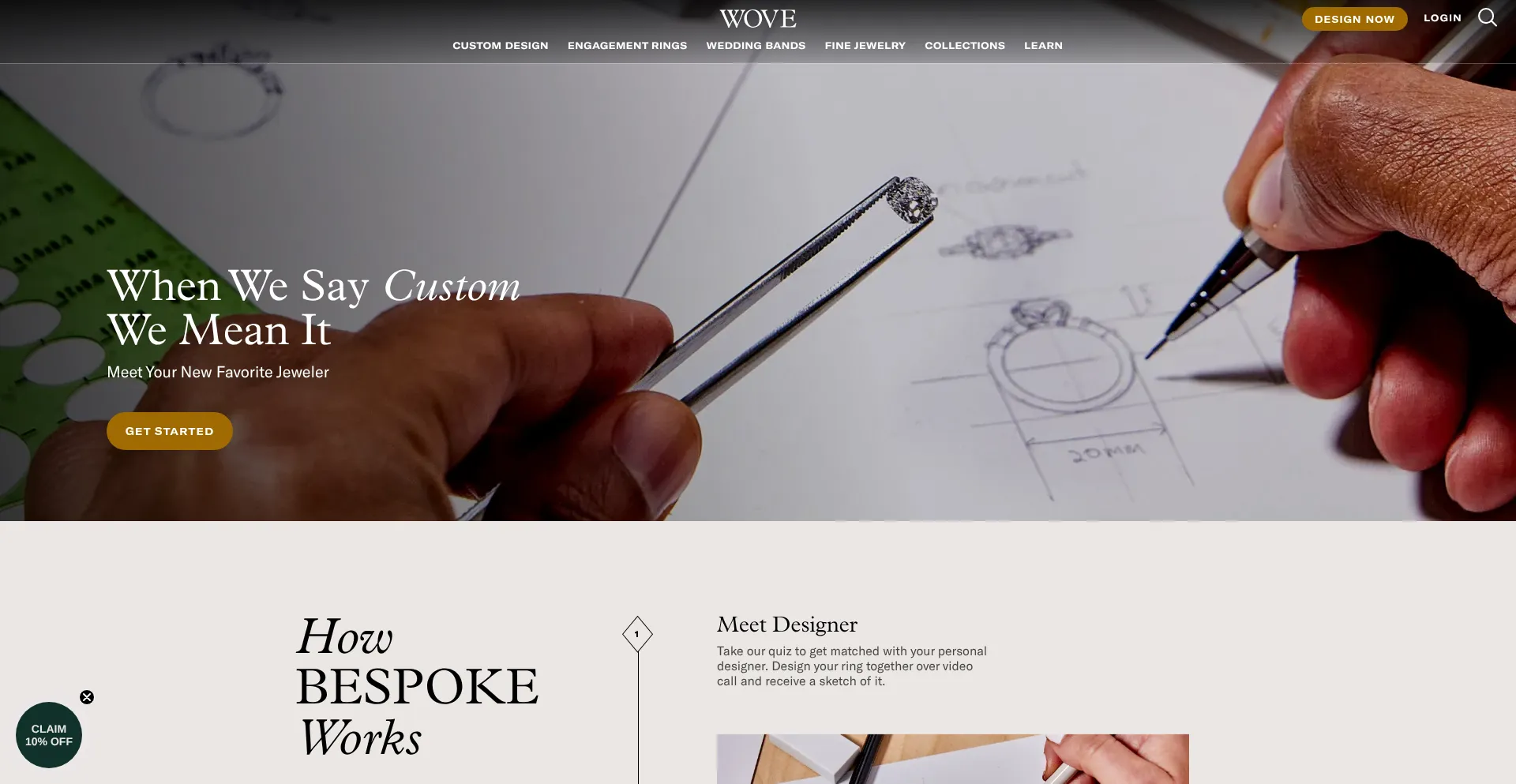 Wove works with you to create a custom engagement ring and provides an exact replica for at-home try-on. Take our quiz to get started creating your own ring.