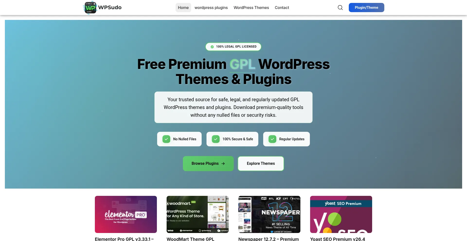 Download free GPL WordPress themes and plugins from WPSudo. Access premium-quality WordPress products at no cost — 100% GPL licensed and regularly updated.