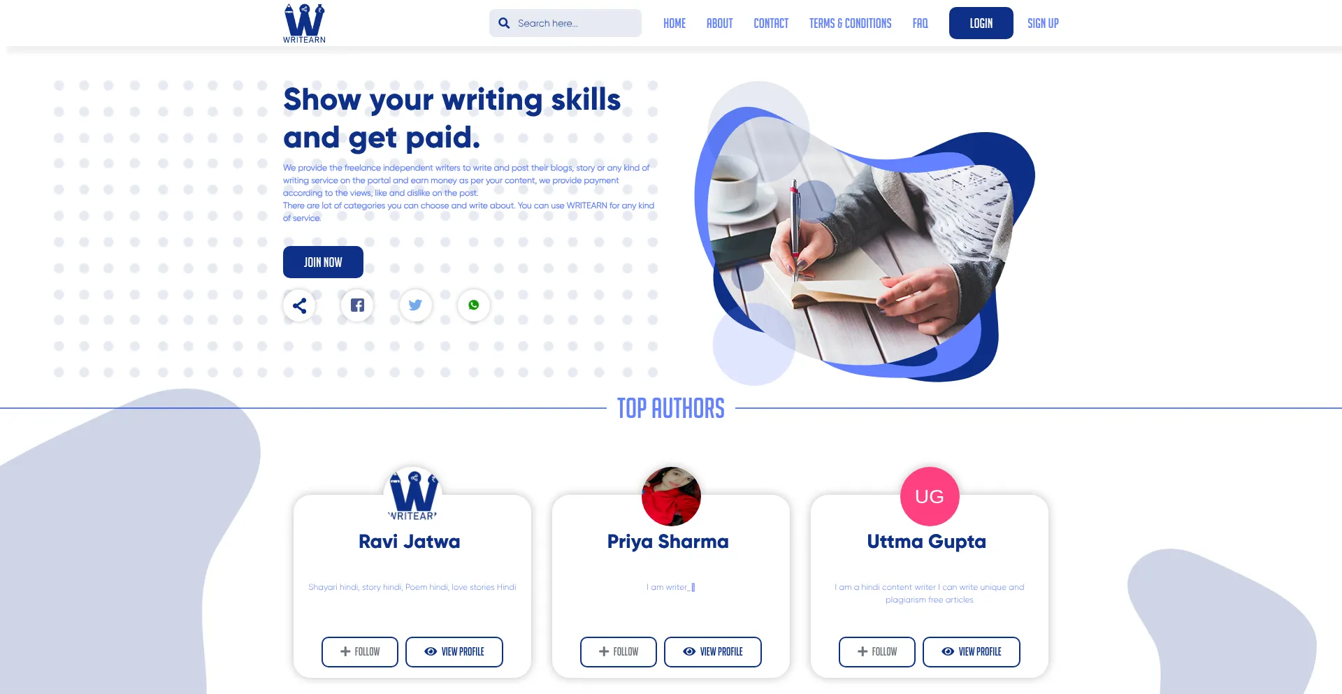 We provide the freelance independent writers to write and post their blogs, story or any kind of writing service on the portal and earn money as per your content, we provide pay...