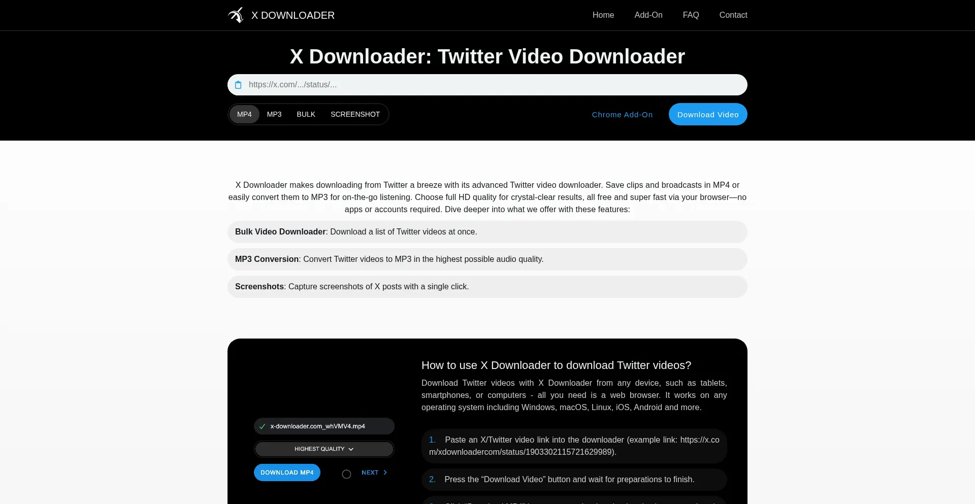 X Downloader is a free Twitter video downloader, download Twitter videos fast and free. Save clips in full HD MP4 or convert to MP3 quickly.