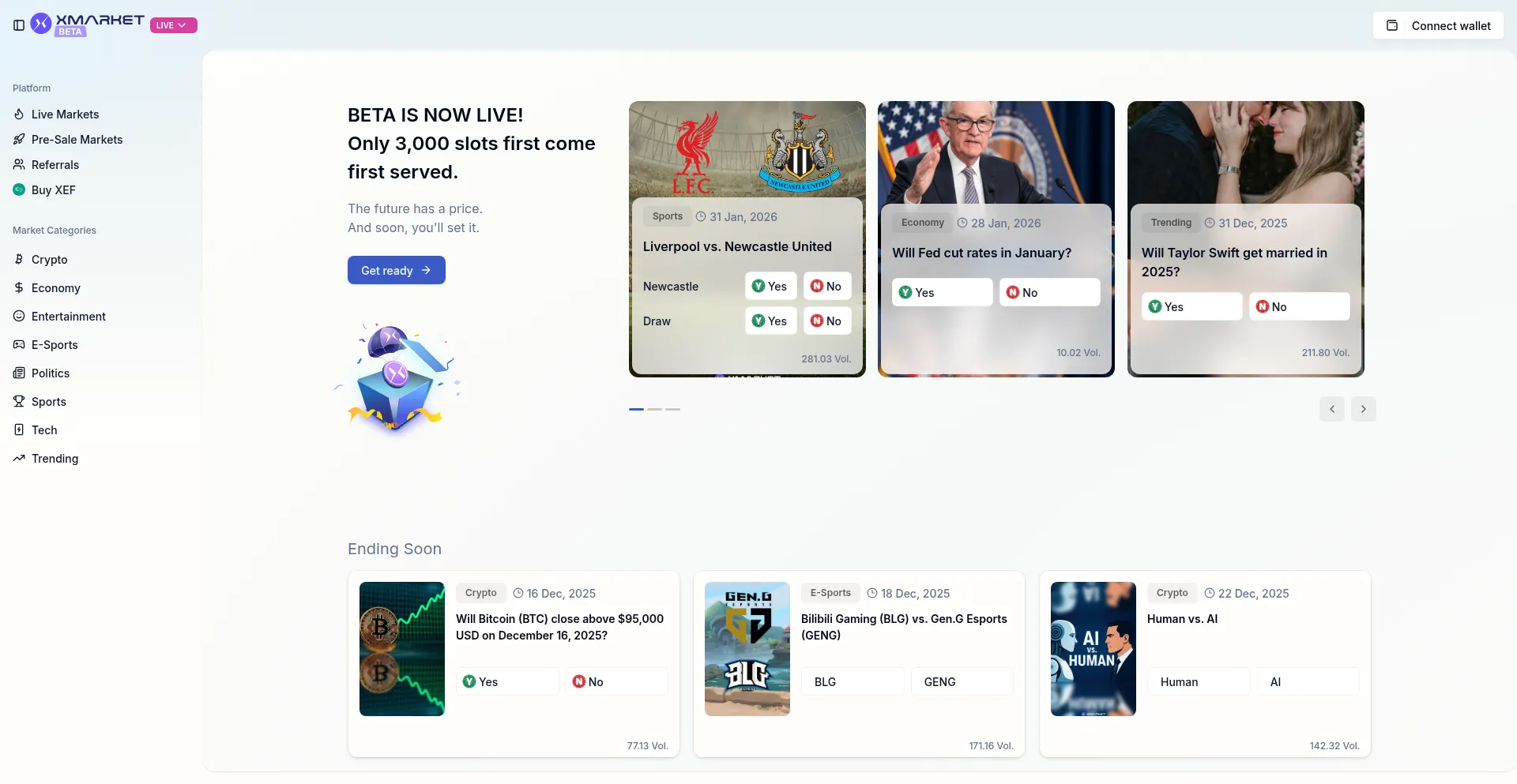 Xmarket is a platform where people everywhere trade beliefs, hedge outcomes, and unlock the collective intelligence of global communities.