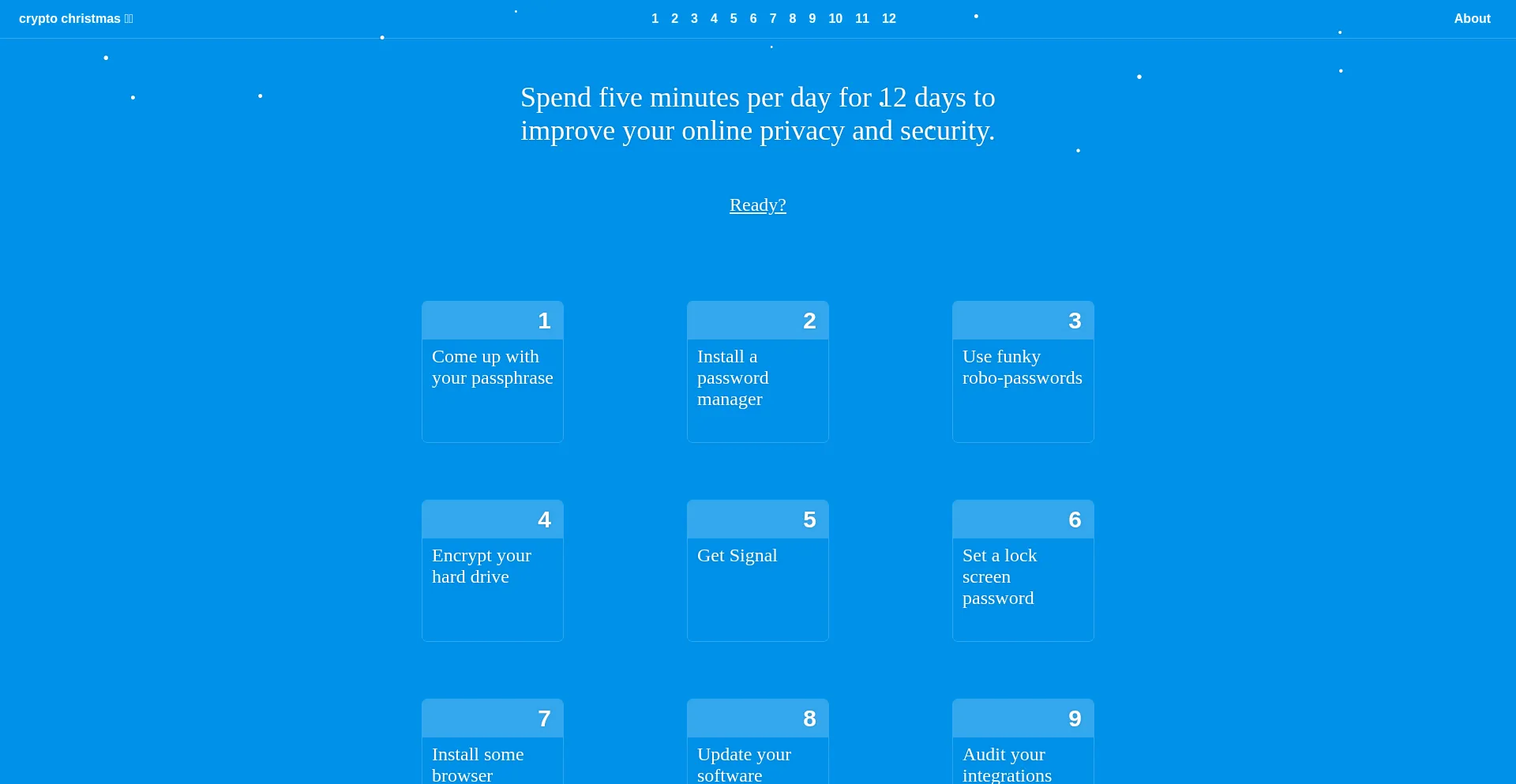Spend five minutes per day for 12 days to improve your online privacy & security. Simple, actionable steps to protect you from surveillance & attack.
