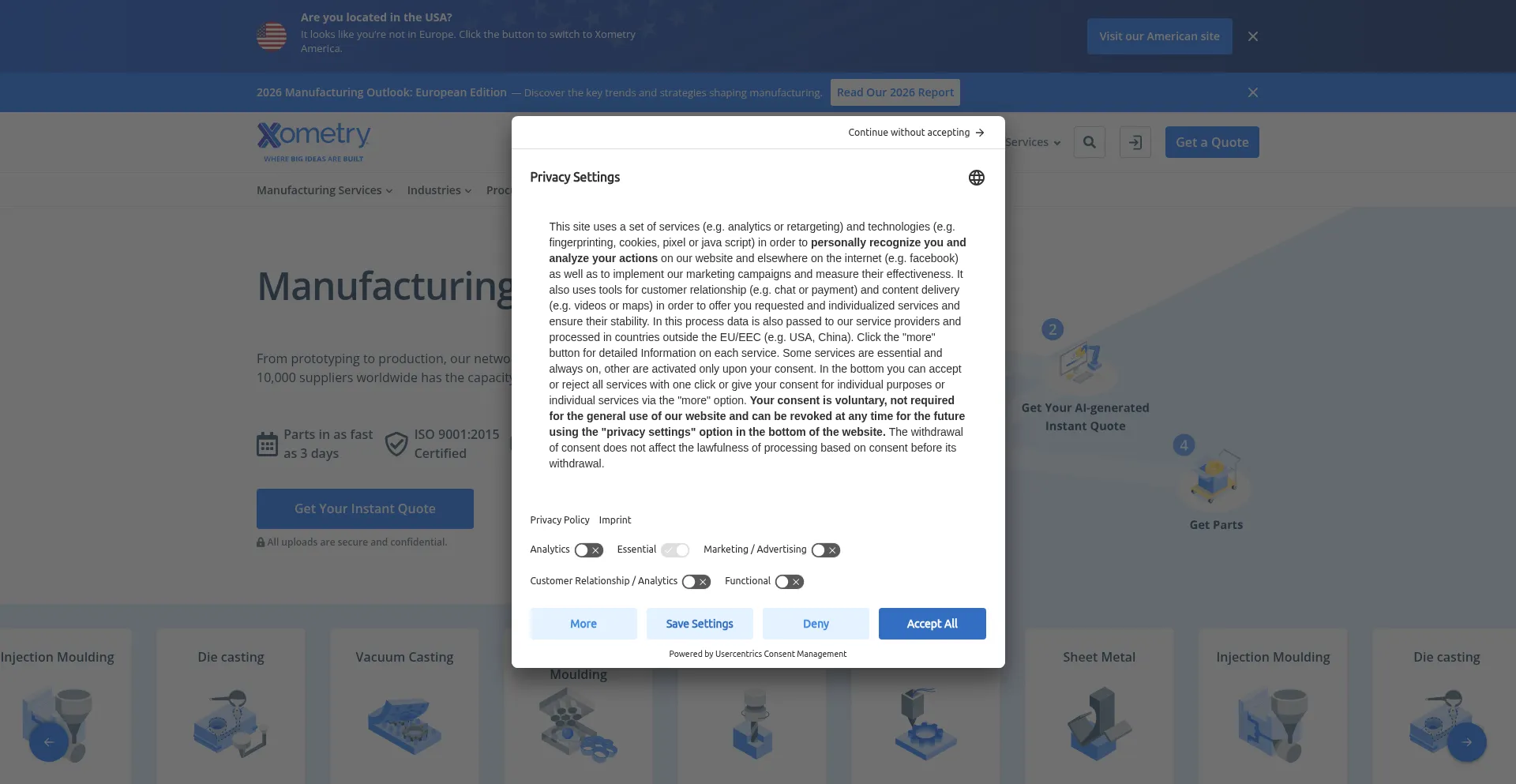The website implements cookie consent mechanisms in compliance with privacy regulations such as GDPR or CCPA. This demonstrates that xometry.eu adheres to data protection standards and provides users with control over personal data collection practices.