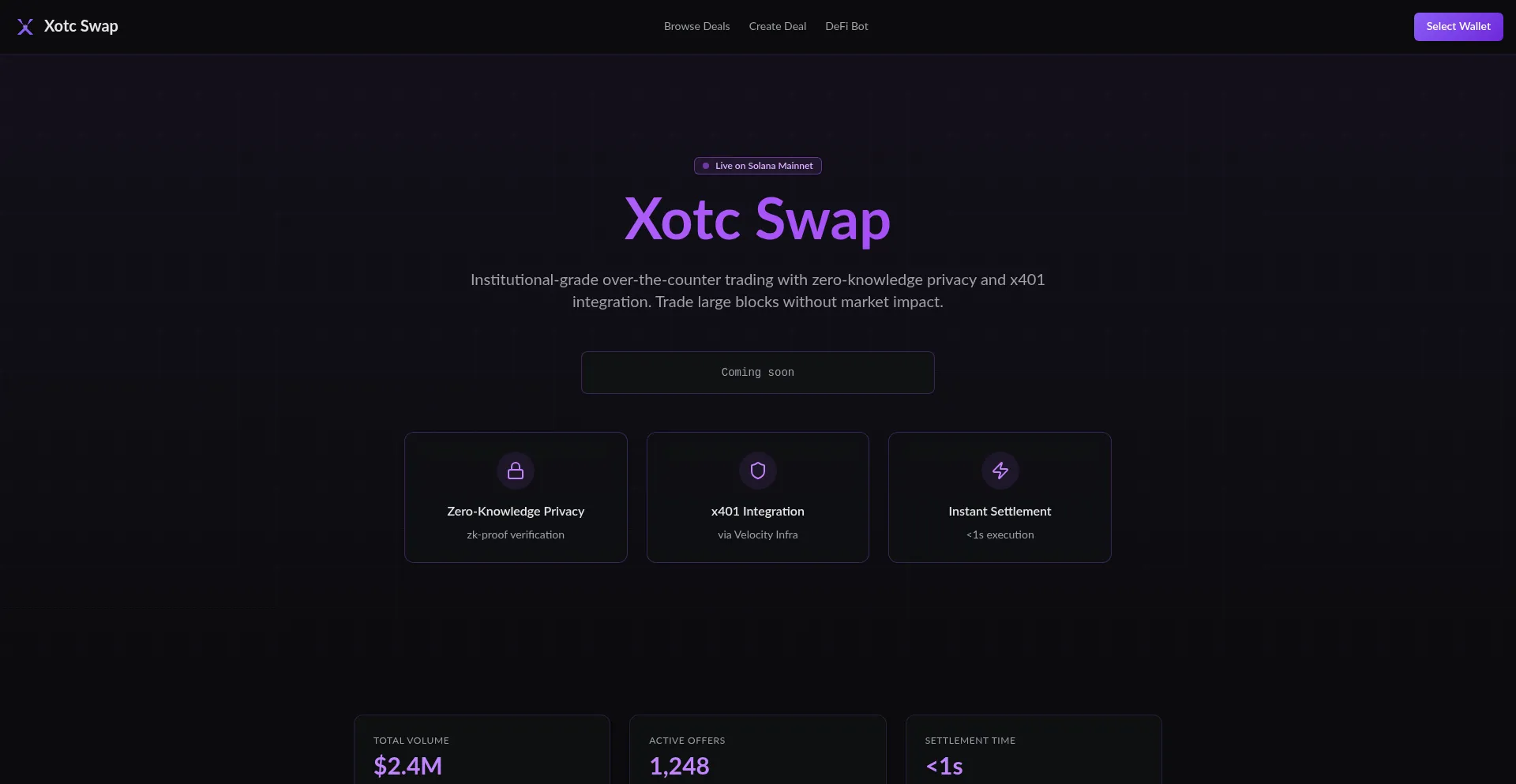 Institutional-grade over-the-counter trading with zero-knowledge privacy and x401 integration. Trade large blocks without market impact.