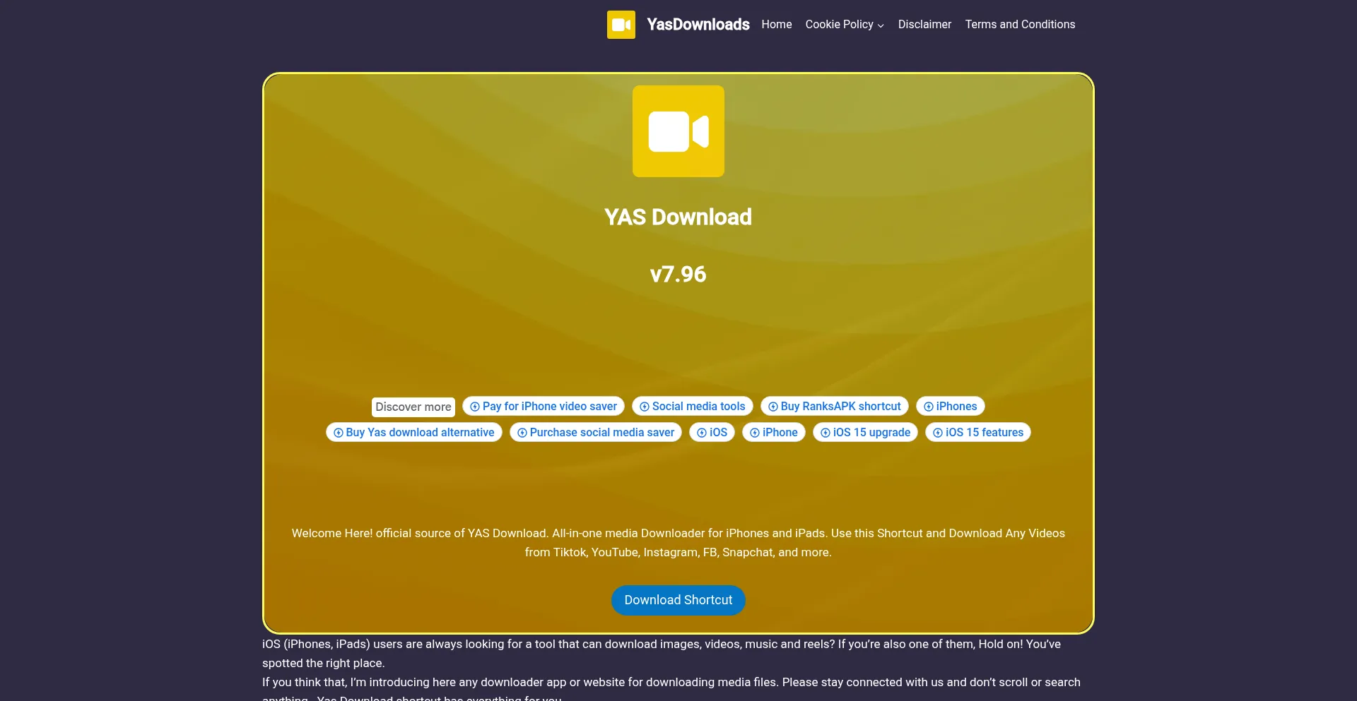Welcome Here! official source of YAS Download. All-in-one media Downloader for iPhones and iPads. Use this Shortcut and Download Any Videos from Tiktok,