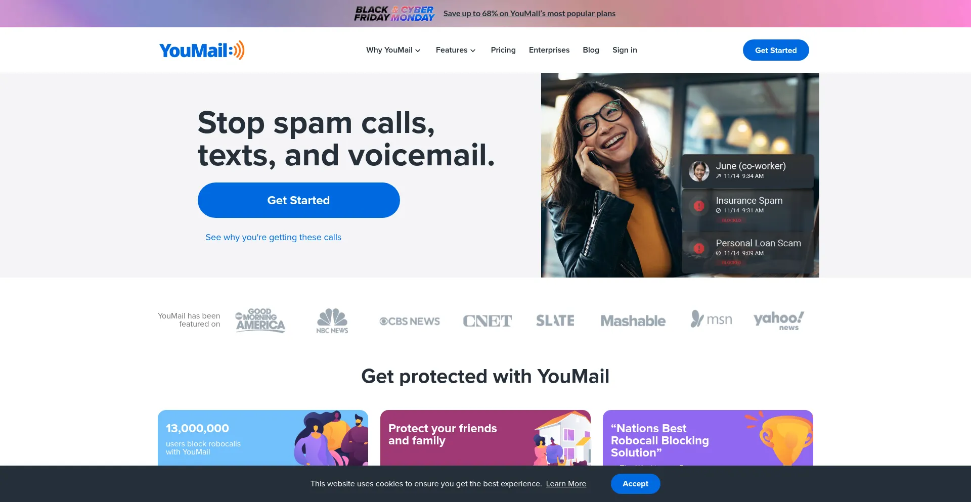 YouMail for iPhone and Android devices. Spam call protection, smarter visual voicemail, virtual assistants, and virtual numbers.