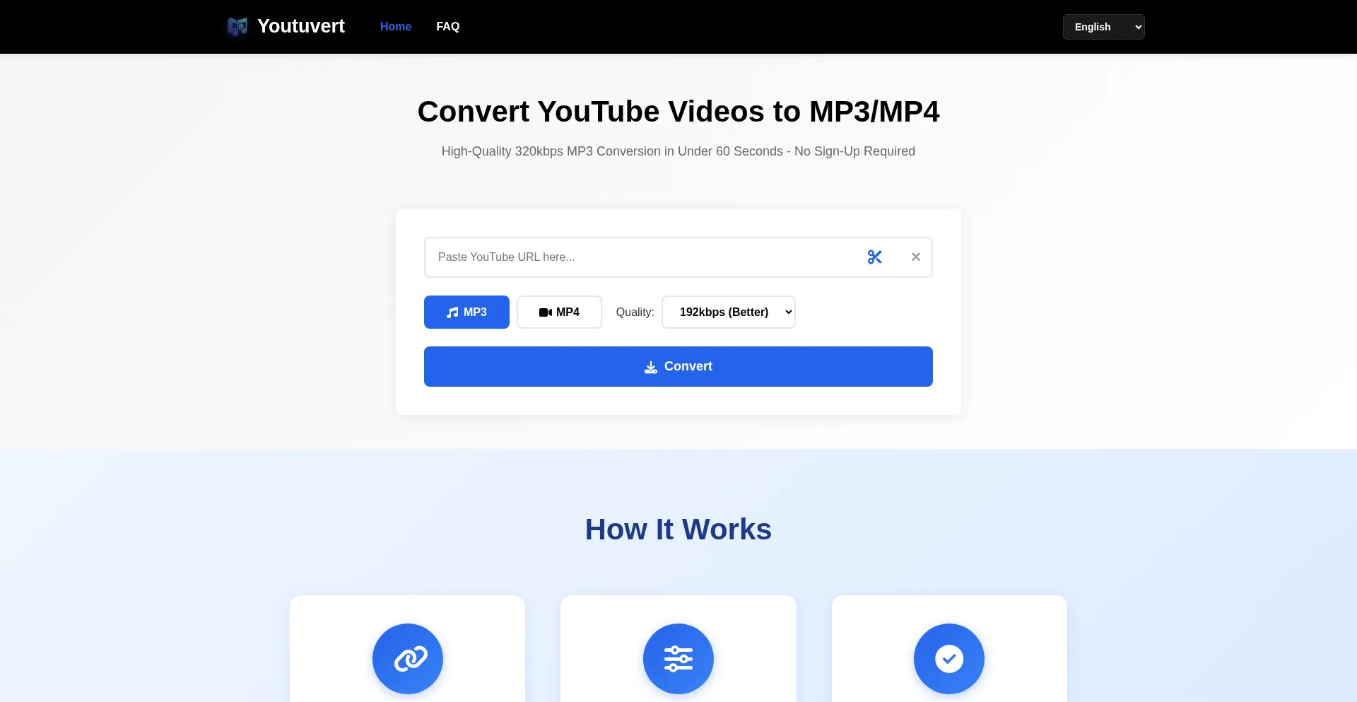 Youtuvert is the fastest online YouTube converter! Instantly convert and download any YouTube video to HD MP4 or high-quality 320kbps MP3. No registration, no ads, completely free.