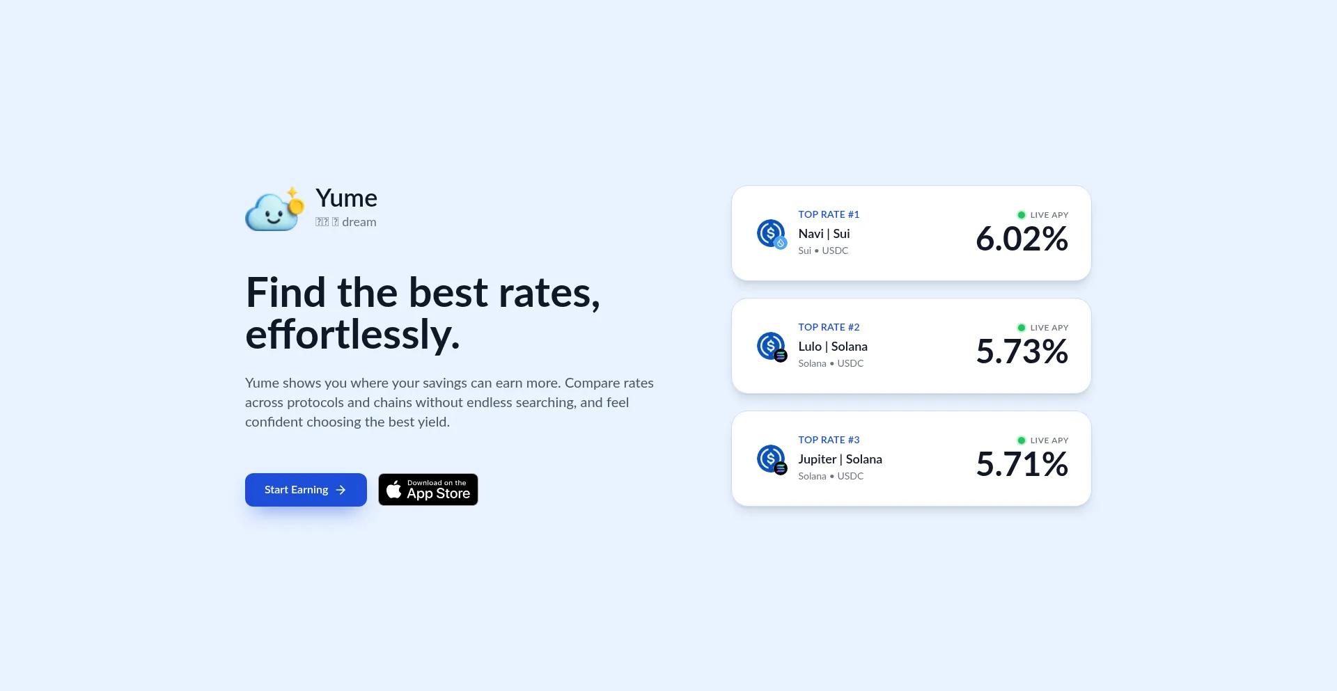 Yume shows you where your savings can earn more. Compare rates across protocols and chains without endless searching, and feel confident choosing the best yield.
