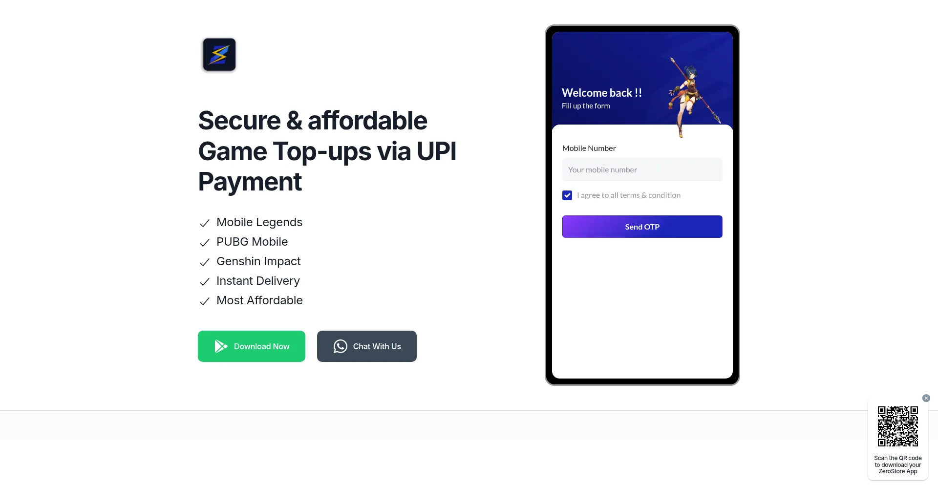 Zero Store Official - Secure and affordable top-ups for Mobile Legends, PUBG Mobile, Genshin Impact, and more. Get game credits and gift cards easily and safely with UPI Payment.