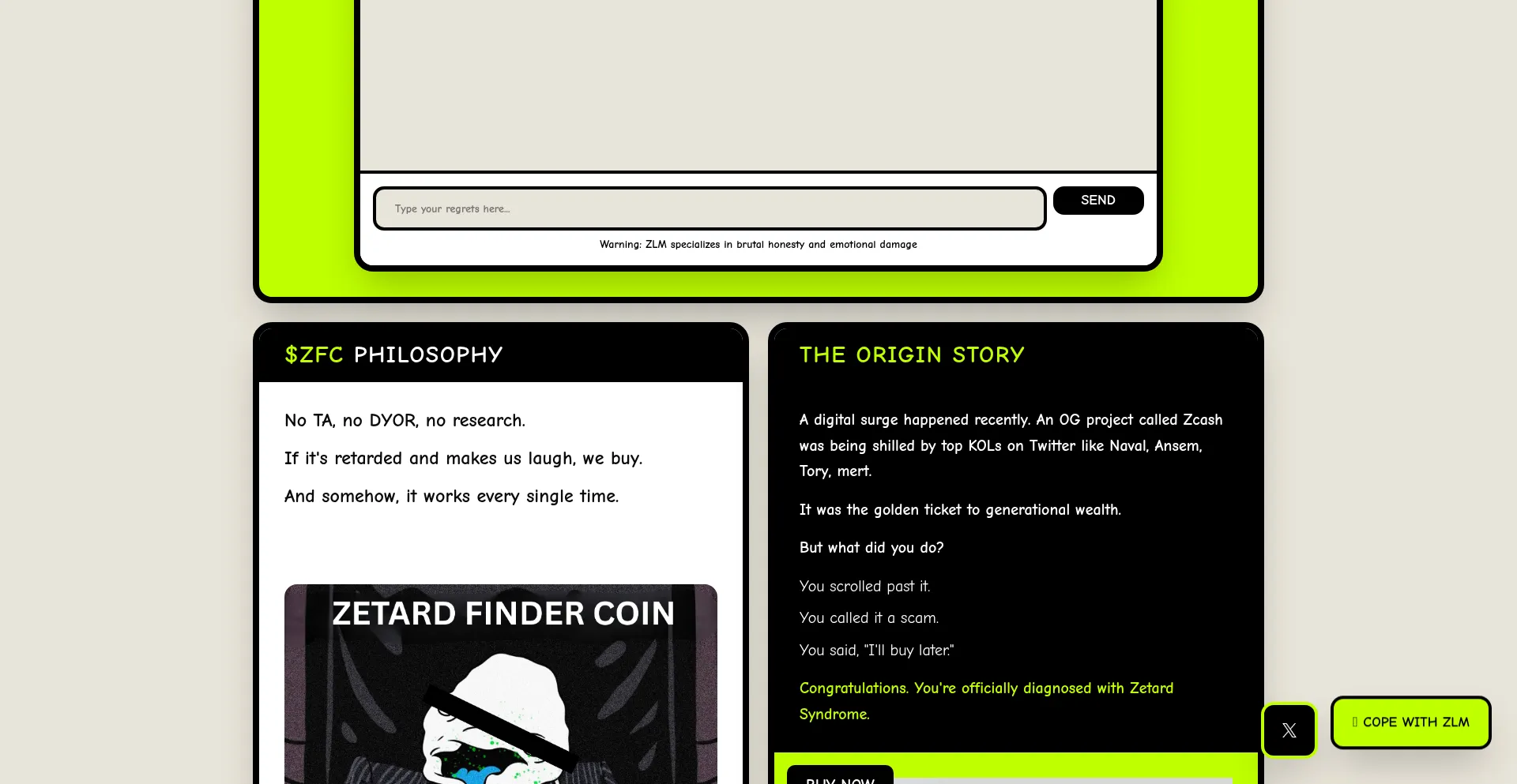 Missed Zcash? You're a Zetard. Join the Church of Copium and hold $ZFC - AI-powered regret management for the financially traumatized.