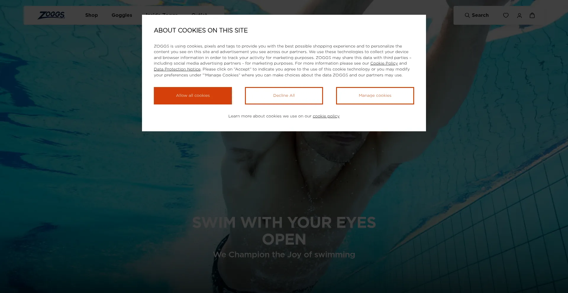 The website implements cookie consent mechanisms in compliance with privacy regulations such as GDPR or CCPA. This demonstrates that zoggs.com adheres to data protection standards and provides users with control over personal data collection practices.