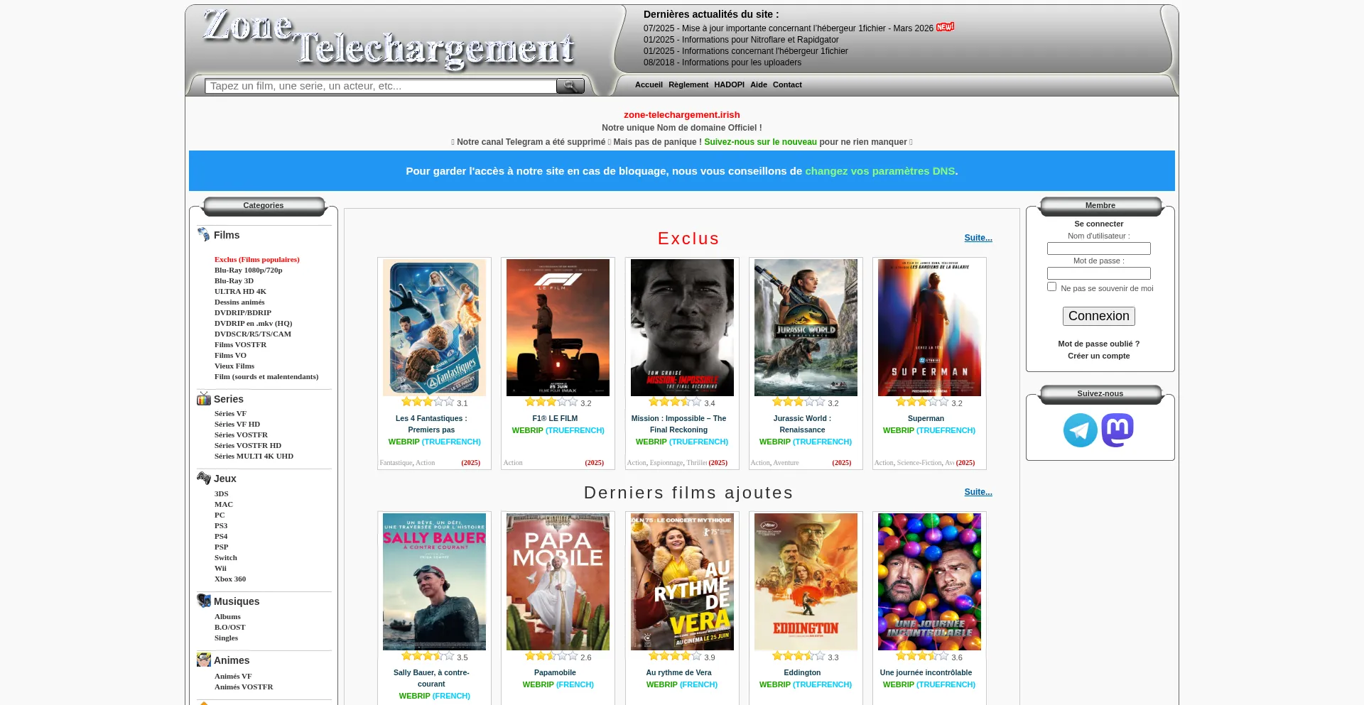 Zone-Telechargement Site de téléchargement gratuit de films, series, jeux, musiques, logiciels, mangas, ebooks sur uptobox, 1fichier, uploaded et en Streaming sur youwatch et ...