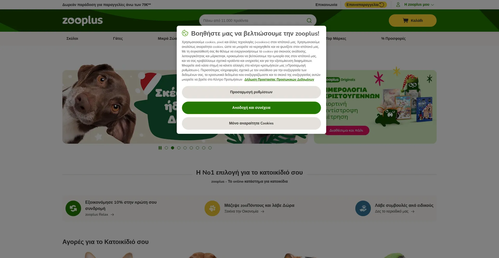 The website implements cookie consent mechanisms in compliance with privacy regulations such as GDPR or CCPA. This demonstrates that zooplus.gr adheres to data protection standards and provides users with control over personal data collection practices.