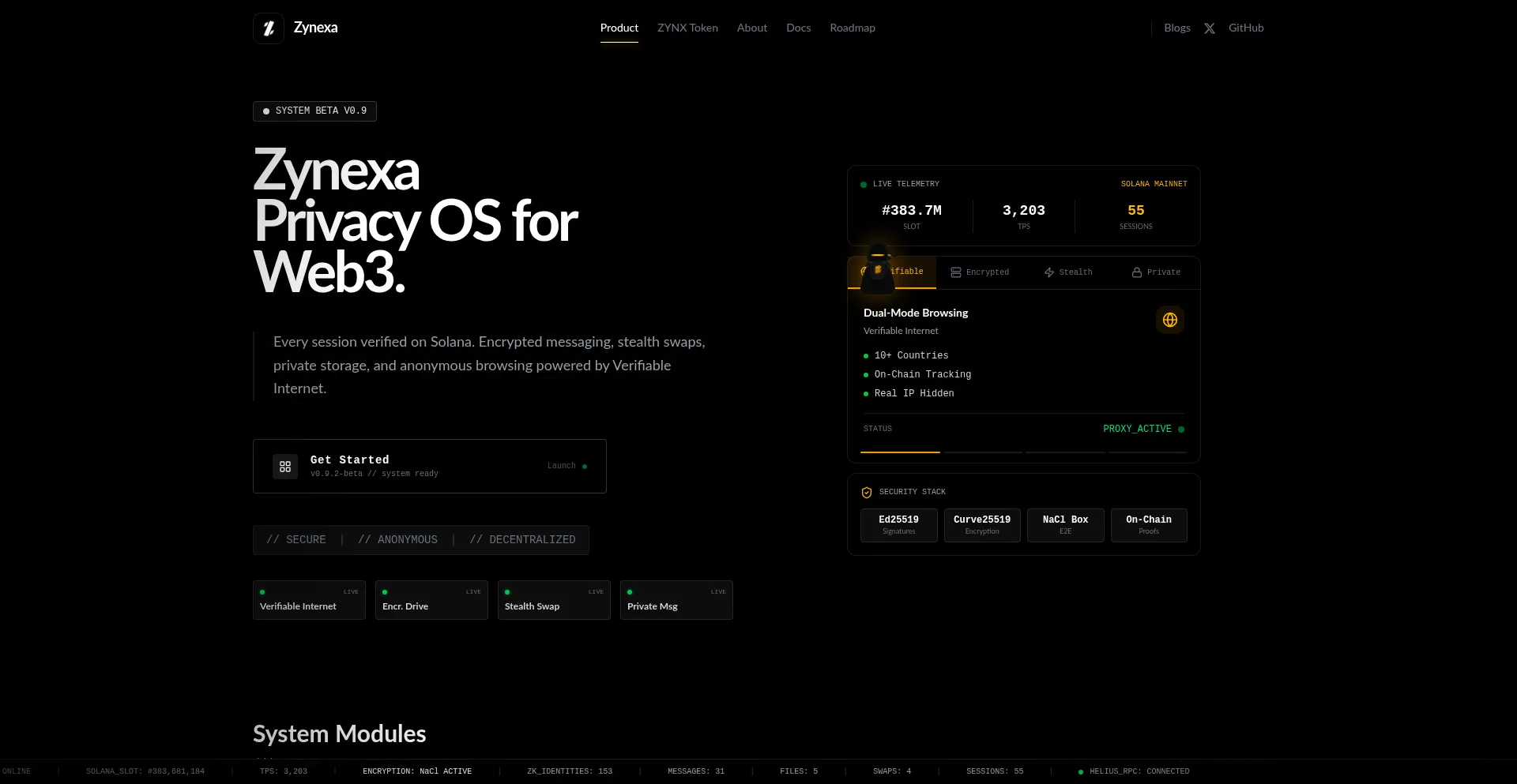 Zero-knowledge identity, encrypted messaging, decentralized storage, stealth swaps, and verifiable internet browsing. Built on Solana blockchain.
